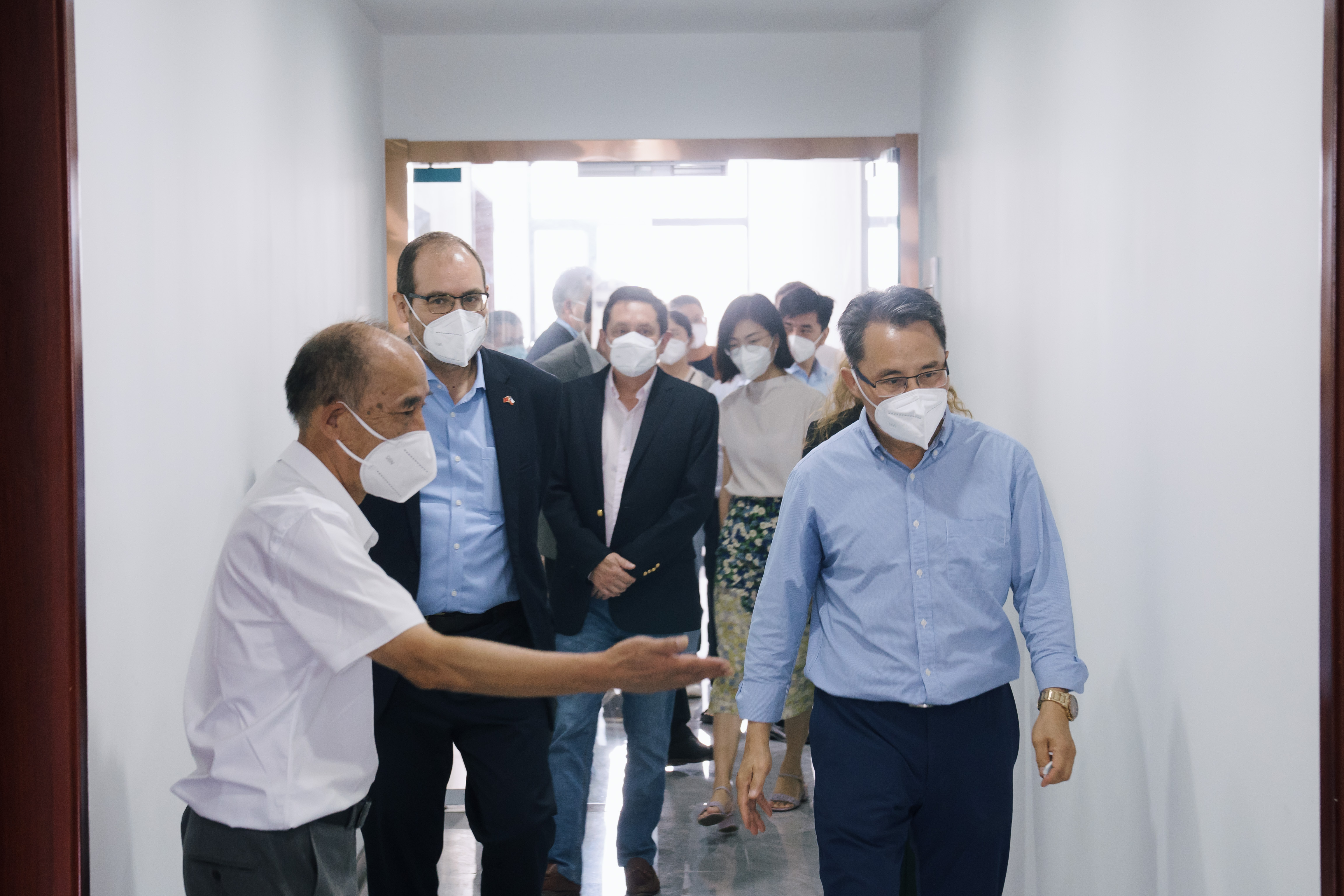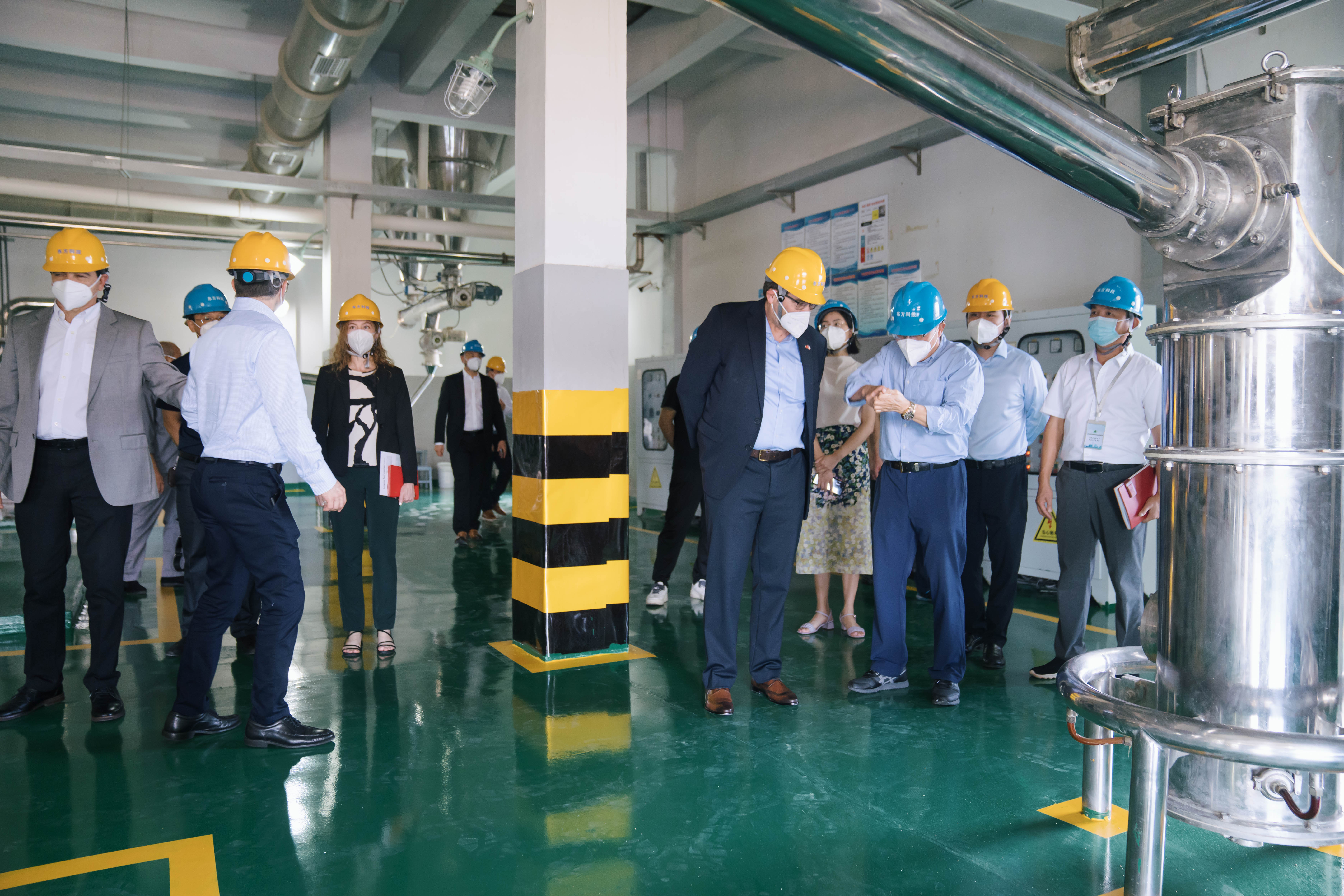 交流結(jié)束后,董事長帶著智利大使及其大使館官員、ASOEX總經(jīng)理一行,深入公司生產(chǎn)、質(zhì)檢各部門進(jìn)行參觀。向各位展示了實(shí)驗(yàn)室用的先進(jìn)儀器和設(shè)備;車間生產(chǎn)用的一些設(shè)備更新與改造;比如全自動(dòng)包裝生產(chǎn)線、年產(chǎn)1400噸的氣流粉碎裝置、日產(chǎn)量12千升的懸浮劑設(shè)備、中型生化污水處理系統(tǒng)等